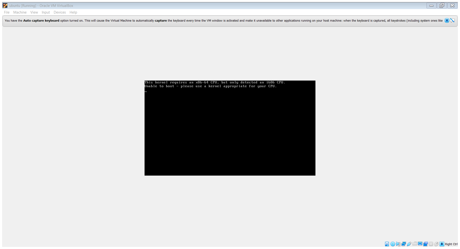 קשה מאד לקרוא אבל הבנתי שהגירסה של לינוקס שבחרת זקוק ל64 ביט בחלק הפנימי שלו, לכן הוא לא יכול.