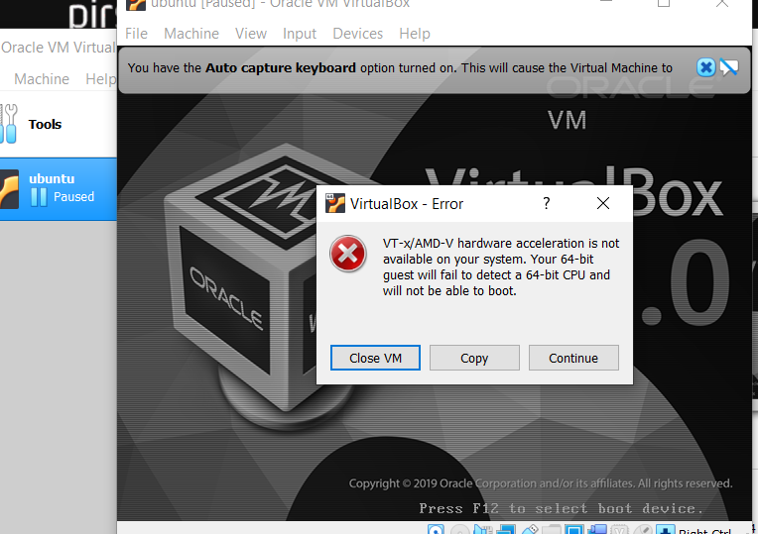 VT-x/AMD-V hardware acceleration is not available on your system. Your 64-bit guest will fail to detect a 64-bit CPU and will not be able to boot.
