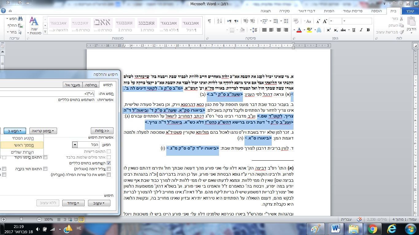יש לי מסמך שמכיל פסקי הלכה, אשר בסוף כל הלכה יש מראי מקום וציונים, אשר אותם אני רוצה להעתיק ולהדביק במסמך אחר [ובתוכנת "תג" ברב טקסט ליצור טקסט רק של המ"מ]. סימנתי את המ"מ ב< בתחילה, וב> בסוף, וחיפשתי ע"י תווים כללים \<*\>, ואכן מצא את כל המ"מ, העתקתי אותם, פתחתי מסמך חדש, וכשהדבקתי הסדר היה הפוך, דהיינו במקום שהמ"מ של סעיף א' יהיה ראשון, הוא אחרון, והמ"מ של סעי' ו', האחרון, מופיע כעת ראשון.