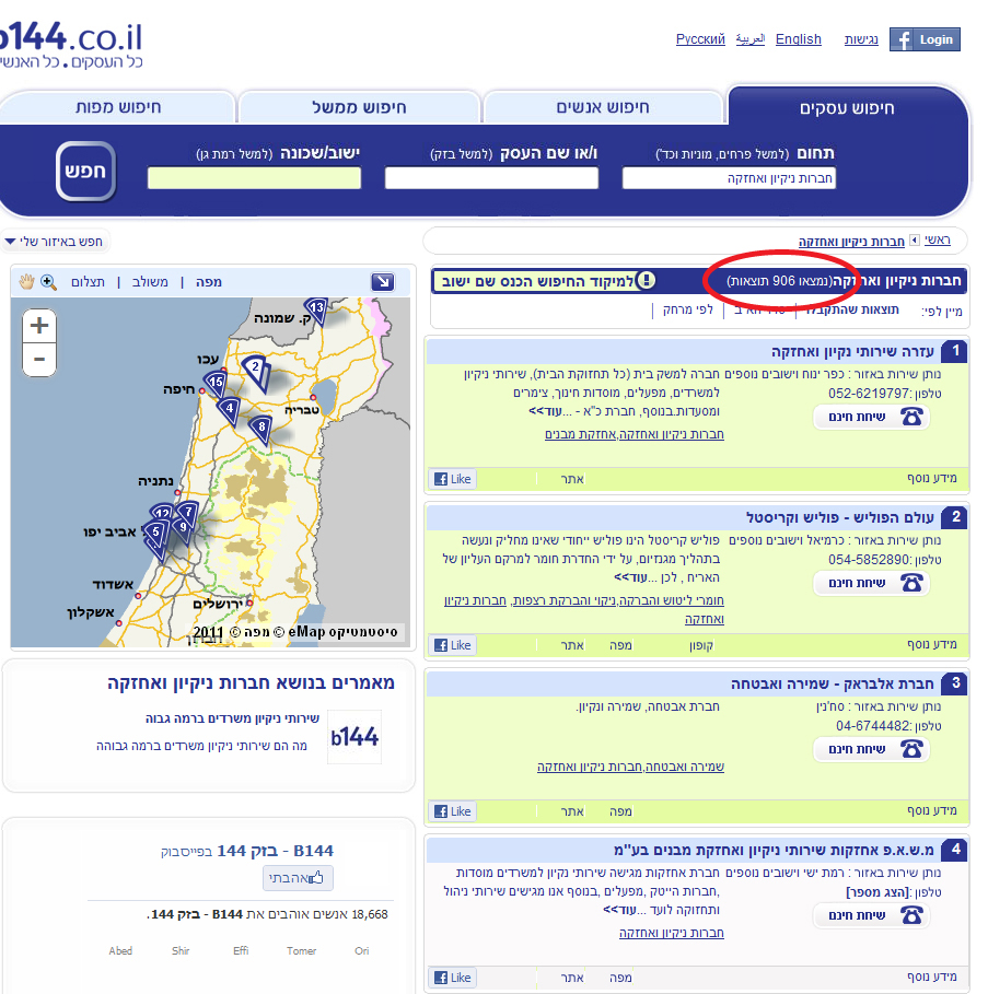 אבל לפני כן. ראשית, חיפוש מהיר באתר 144, הכנסתי לתחום החיפוש "אחזקת בתים" מתברר כי יש 906 חברות שנותנות שירותים בתחום "חברות נקיון ואחזקה".