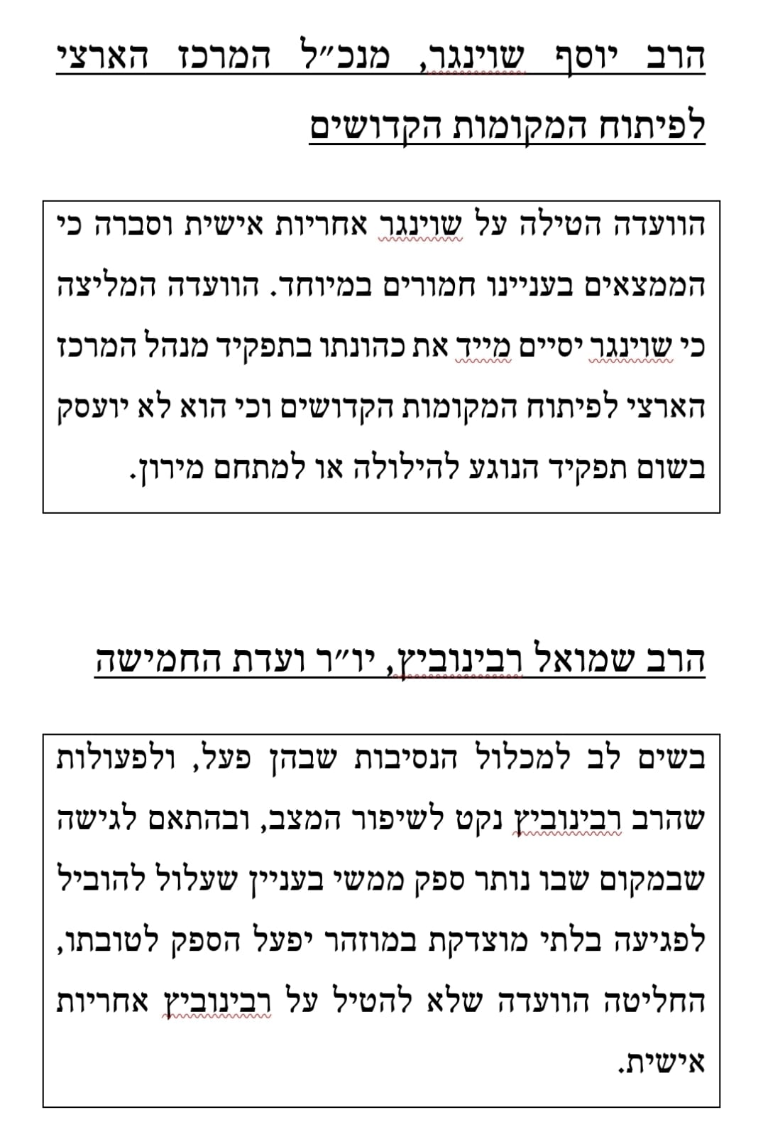בשים לב למכלול הנסיבות שבהן פעל, ולפעולות שהרב רבינוביץ נקט לשיפור המצב, ובהתאם לגישה שבמקום שבו נותר ספק ממשי בעניין שעלול להוביל לפגיעה בלתי מוצדקת במוזהר יפעל הספק לטובתו, החליטה הוועדה שלא להטיל על רבינוביץ אחריות אישית.