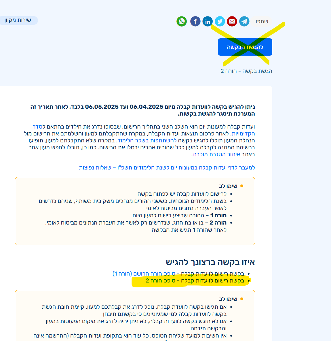 לפי נתוני המערכת אינך מוגדר כהורה שני לצורך השלמת הרישום לוועדות קבלה. ייתכן שהנתונים טרם נטענו במערכת, אנא נסה שוב בעוד כשעה