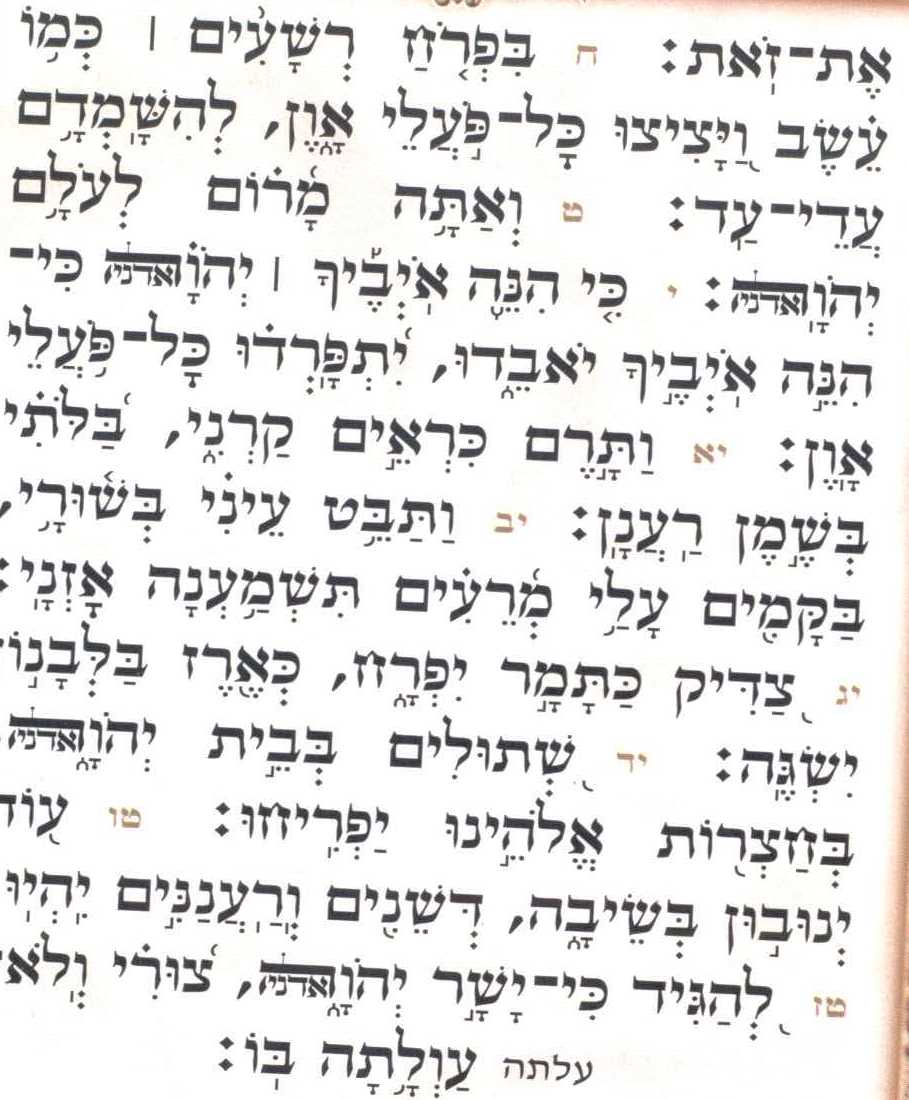 אלְדָוִד אֵלֶיךָ יי נַפְשִׁי אֶשָּׂא:באֱלֹהַי בְּךָ בָטַחְתִּי אַל אֵבוֹשָׁה אַל יַעַלְצוּ אֹיְבַי לִי:גגַּם כָּל קוֶֹיךָ לֹא יֵבֹשׁוּ יֵבֹשׁוּ הַבּוֹגְדִים רֵיקָם:דדְּרָכֶיךָ יי הוֹדִיעֵנִי אֹרְחוֹתֶיךָ לַמְּדֵנִי:ההַדְרִיכֵנִי בַאֲמִתֶּךָ וְלַמְּדֵנִי כִּי אַתָּה אֱלֹהֵי יִשְׁעִי אוֹתְךָ קִוִּיתִי כָּל הַיּוֹם:וזְכֹר רַחֲמֶיךָ יי וַחֲסָדֶיךָ כִּי מֵעוֹלָם הֵמָּה:זחַטֹּאות נְעוּרַי וּפְשָׁעַי אַל תִּזְכֹּר כְּחַסְדְּךָ זְכָר לִי אַתָּה לְמַעַן טוּבְךָ יי:חטוֹב וְיָשָׁר יי עַל כֵּן יוֹרֶה חַטָּאִים בַּדָּרֶךְ:טיַדְרֵךְ עֲנָוִים בַּמִּשְׁפָּט וִילַמֵּד עֲנָוִים דַּרְכּוֹ:יכָּל אָרְחוֹת יי חֶסֶד וֶאֱמֶת לְנֹצְרֵי בְרִיתוֹ וְעֵדֹתָיו:יאלְמַעַן שִׁמְךָ יי וְסָלַחְתָּ לַעֲוֹנִי כִּי רַב הוּא:יבמִי זֶה הָאִישׁ יְרֵא יי יוֹרֶנּוּ בְּדֶרֶךְ יִבְחָר:יגנַפְשׁוֹ בְּטוֹב תָּלִין וְזַרְעוֹ יִירַשׁ אָרֶץ:ידסוֹד יי לִירֵאָיו וּבְרִיתוֹ לְהוֹדִיעָם:טועֵינַי תָּמִיד אֶל יי כִּי הוּא יוֹצִיא מֵרֶשֶׁת רַגְלָי:טזפְּנֵה אֵלַי וְחָנֵּנִי כִּי יָחִיד וְעָנִי אָנִי:יזצָרוֹת לְבָבִי הִרְחִיבוּ מִמְּצוּקוֹתַי הוֹצִיאֵנִי:יחרְאֵה עָנְיִי וַעֲמָלִי וְשָׂא לְכָל חַטֹּאותָי:יטרְאֵה אוֹיְבַי כִּי רָבּוּ וְשִׂנְאַת חָמָס שְׂנֵאוּנִי:כשָׁמְרָה נַפְשִׁי וְהַצִּילֵנִי אַל אֵבוֹשׁ כִּי חָסִיתִי בָךְ:כאתֹּם וָיֹשֶׁר יִצְּרוּנִי כִּי קִוִּיתִיךָ:כבפְּדֵה אֱלֹהִים אֶת יִשְׂרָאֵל מִכֹּל צָרוֹתָיו: