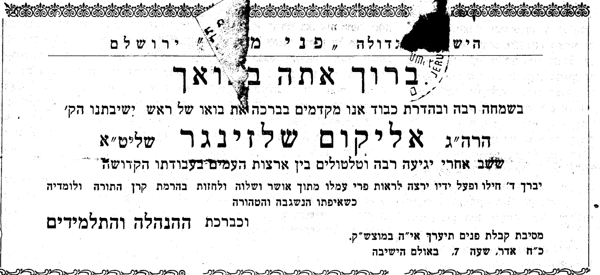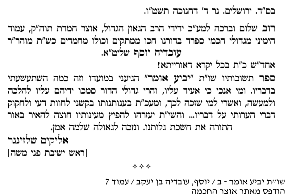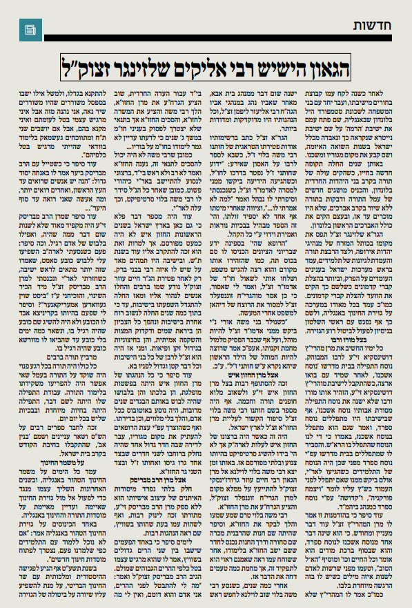 ב.ד.ה. זקן ראשי הישיבות הגאון האדיר רבי אליקים שלזינגר זצוק"ל