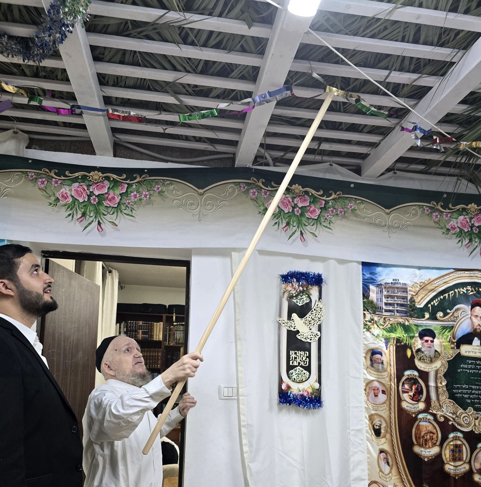 פוסק הדור הגר"מ שטרנבוך מסייע לנכדיו בהנחת הסכך לסוכתו ברחבת ביתו בהר נוף