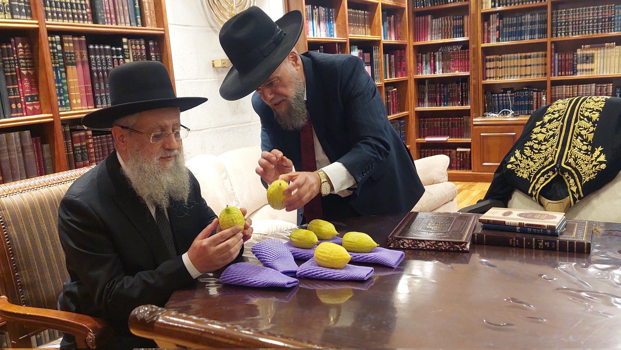 לצד גלימת אביו מרן בעל ה'יביע אומר': הראשון לציון ובעל ההלכה ברורה, הגאון רבי דוד יוסף בוחר בקפידא אתרוג מרוקאי מהודר מבית 'קריספל - תרודאנת, היהלומים שבכתר', כשלצידו מקורבו הרב יגאל קריספל, רב שכונה בנתניה.