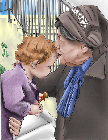 במחשבה שניה, יכול להיות שנוצרת כאן דווקא מחשבה על המאמץ של הסבתא בחיבור הבין דורי, שהוא כידוע לכולנו לא פשוט. הדבקות של הסבתא בנשיקה, מצד אחד, וההפרעה של הסורג - את יודעת מה? זה דווקא יכול להיות מעניין, אבל אם רוצים את הכיוון הזה צריך לעבוד על זה כי כרגע זה מפריע בעין. המצב הקיים הוא שהמישור האחורי של הציור מתחרה עם המישור הקדמי. תחשבי על זה.