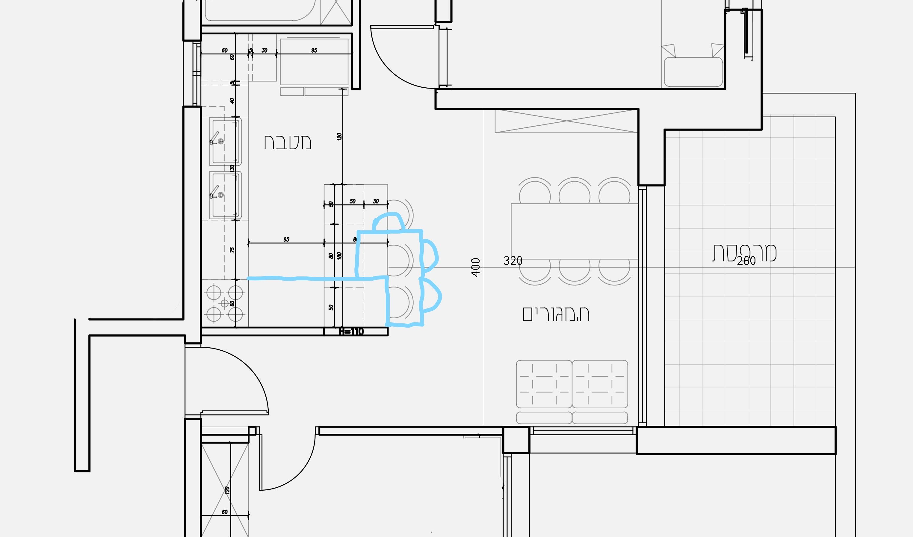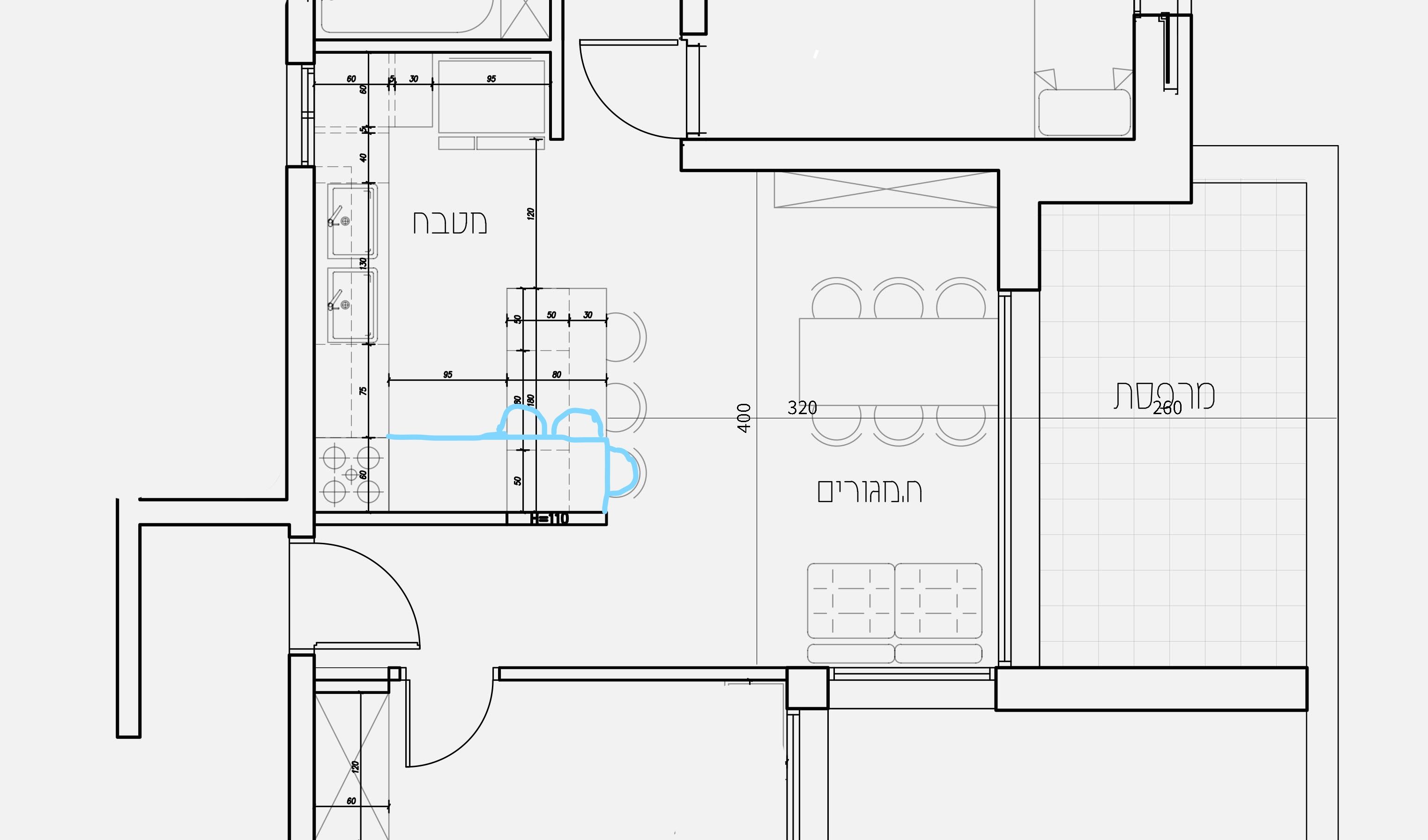 המרחק שהיה בין הדלפק לשיש בשרטוט שהעלית צפוף מאד ולא נח ואם את פולשת לכיוון הסלון