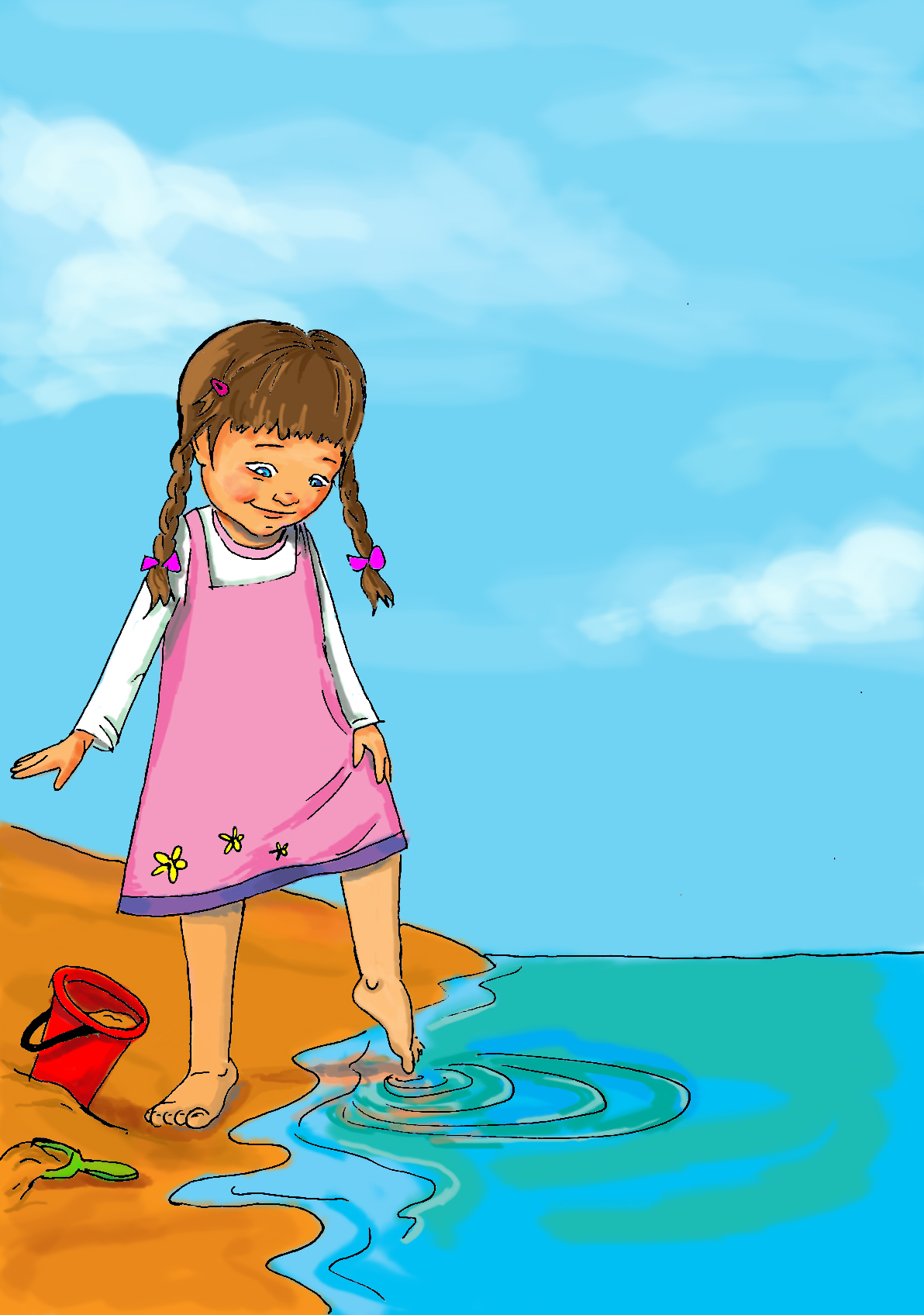חמוד מאד! אהבתי את כף הרגל הטובלת במים, ובכלל את סגנון הקו. היד הימנית קצרה וצרה מדי (או בקצרה: קצר-צרה!), צבע המים כצבע השמים, כמעט, ולחול ים יש צבע רך ובהיר הרבה יותר.
