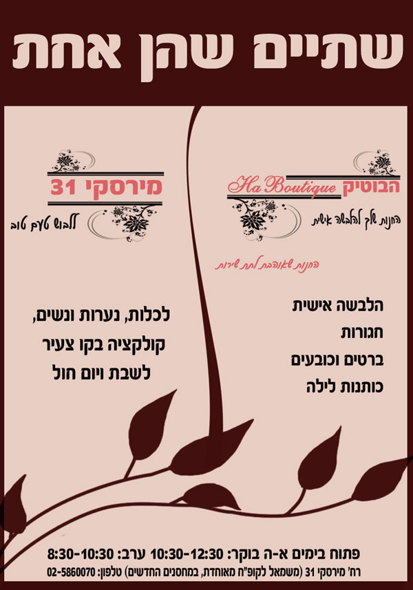 גינגית, המודעה יפה מאוד, אבל אני מכירה אישית את בעלת העסק, ודווקא הסגנון הראשון מתאים לה יותר, הצבעוניות של הבגדים והחגורות, לא מתאים לה,