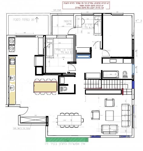 לא עקבתי מדי אבל יש פה באמת הרבה שטח מבוזבז, תחשבי אולי לסגור קצת לאיזו מבואת כניסה יפה, (שנכנסים מיד לסלון זה לא היה תמיד ככה, ואם תצליחו לאו הפרדה של נגרות/משרביה/קיר לעשות מבואת כניסה יפה זה מהמם!