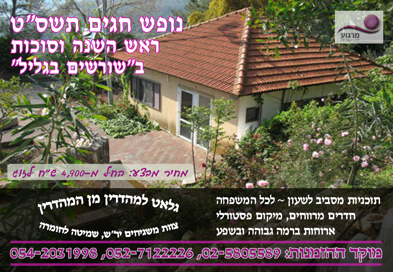 מצ"ב מודעה על נופש בחגים הבעל"ט, אשמח אם תגיבו לי על המודעה, אני חדש בתחום ולכן חסר לי את הנסיון שיש לכולם, ולכן ההערות וההארות חשובות לי מאוד, בתודה מראש.