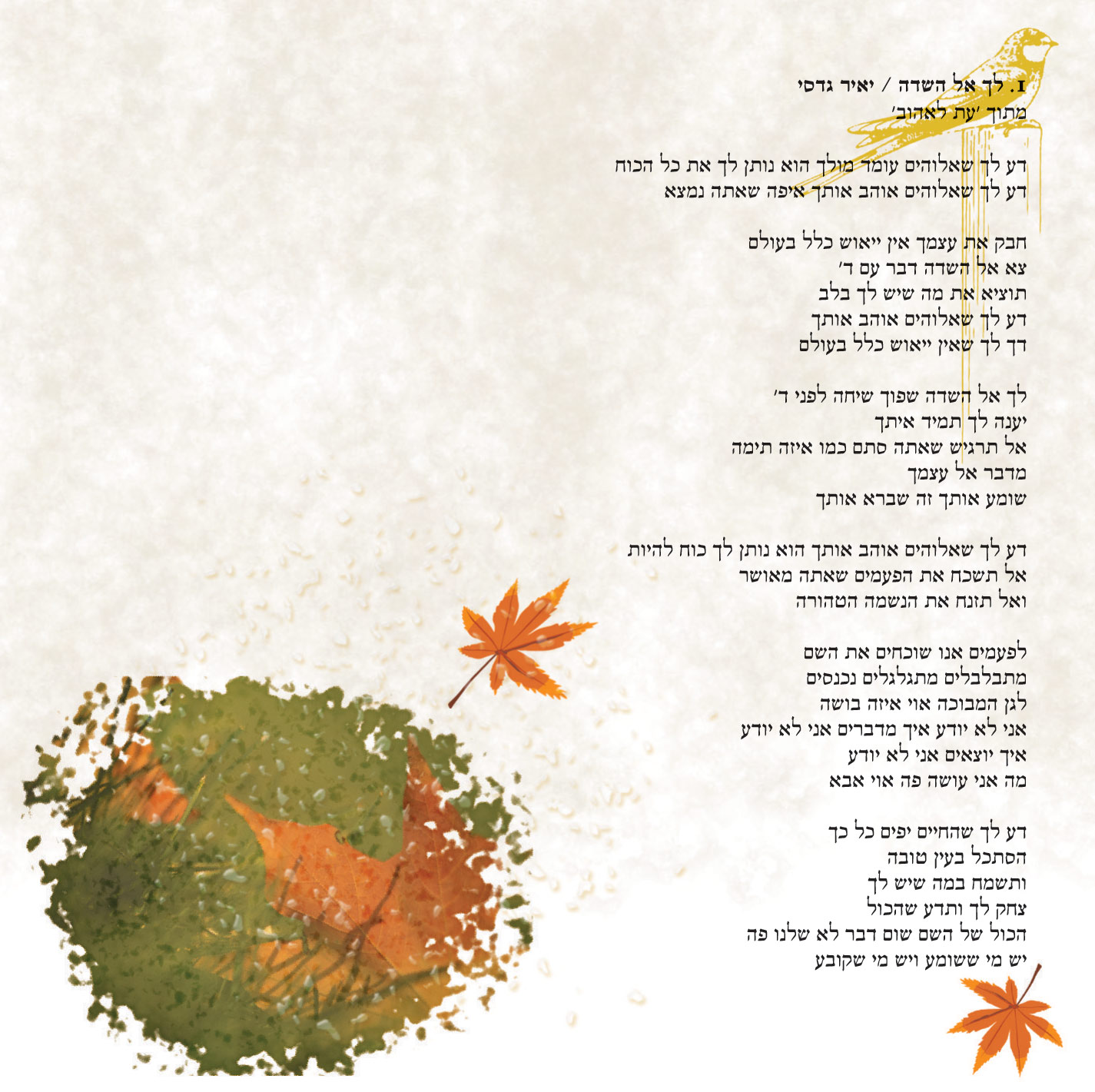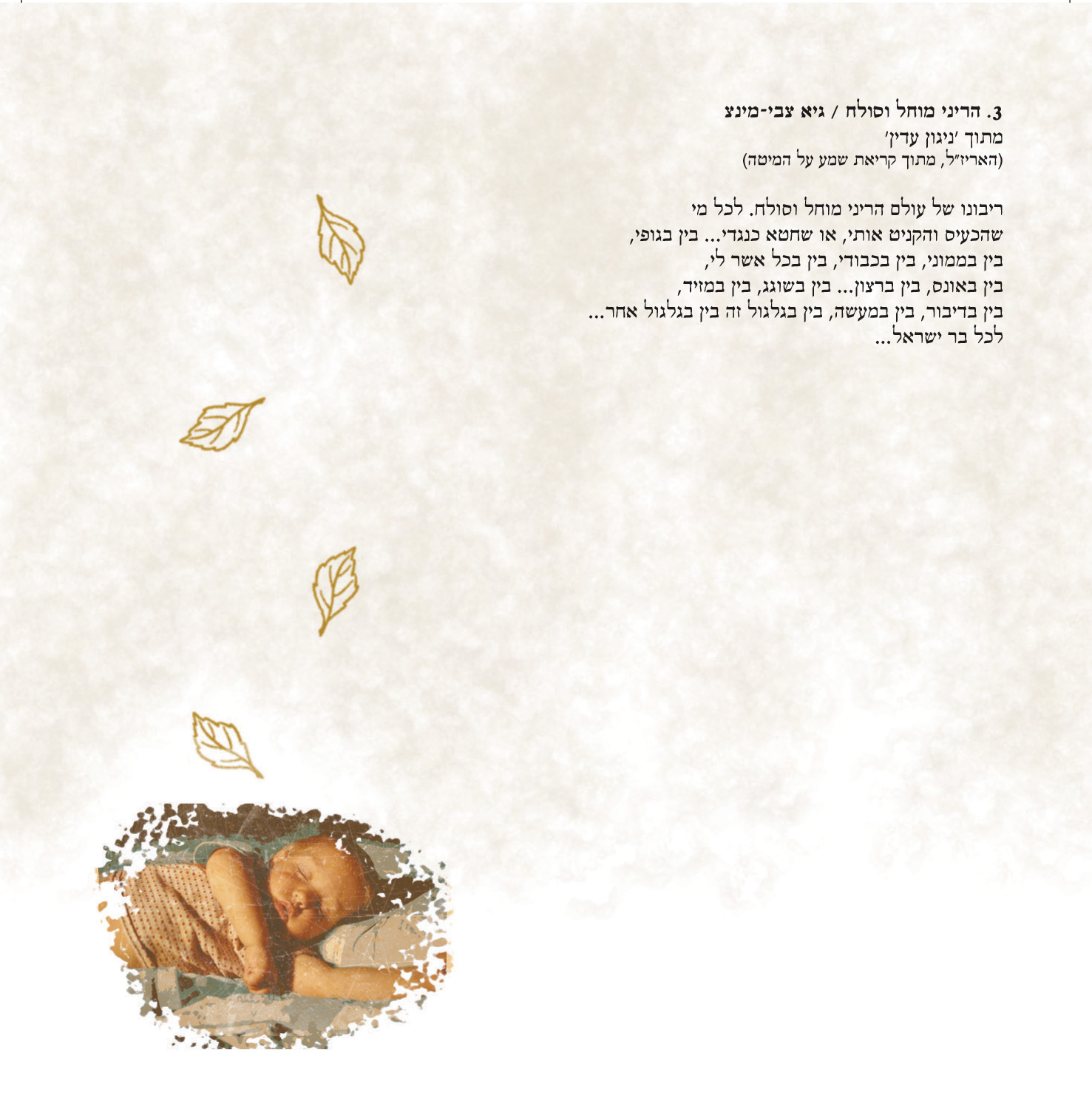 מעבר לזה, העיצוב באמת מיוחד, מתאים בדיוק לתוכן. העיצוב של רצועה 5-6 (של נעליך) הכי מוצלח לדעתי, וגם העלים של הריני מוחל. שוב, עדיין קצת קשה לי להתחבר לציבעוניות. אולי כי זה משלב גם כמה סגנונות (עיטורים ויקטוריים עם תמונות מעובדות) ושום דבר שמאחד בינהם?