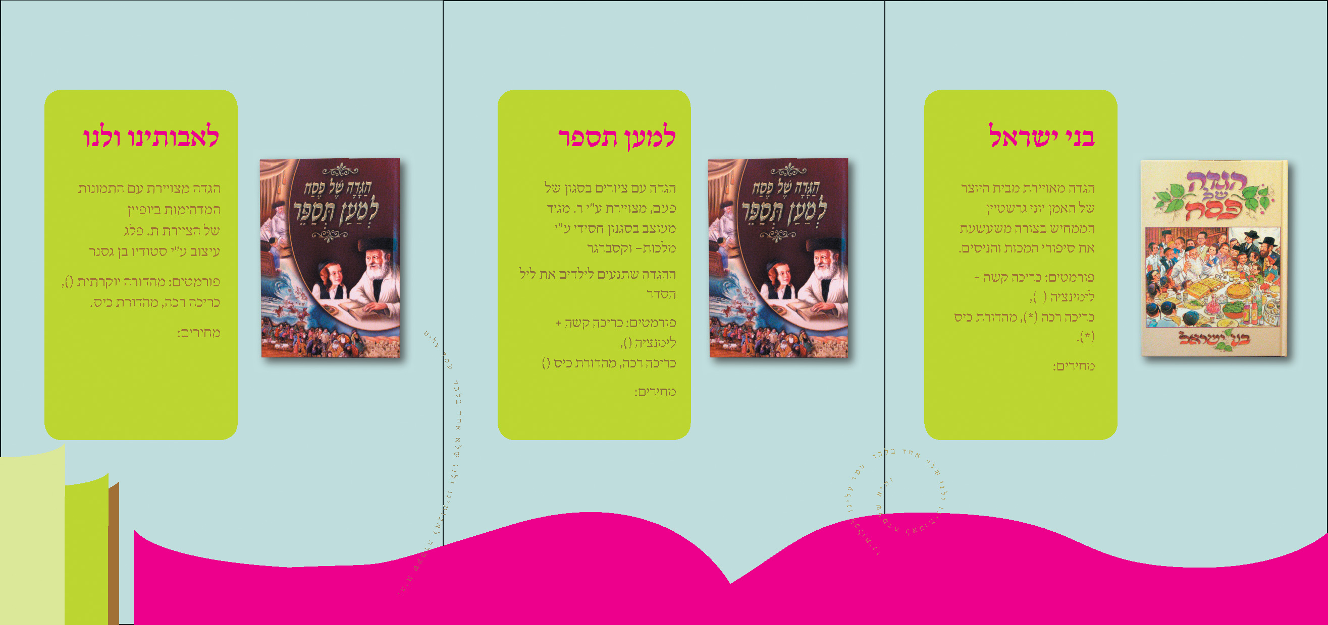 אשמח לשמוע הערותיכם והארותיכם על הקונספט הכללי. (הטקסט סביב נתיב בכריכה זה פסוקים מן ההגדה)