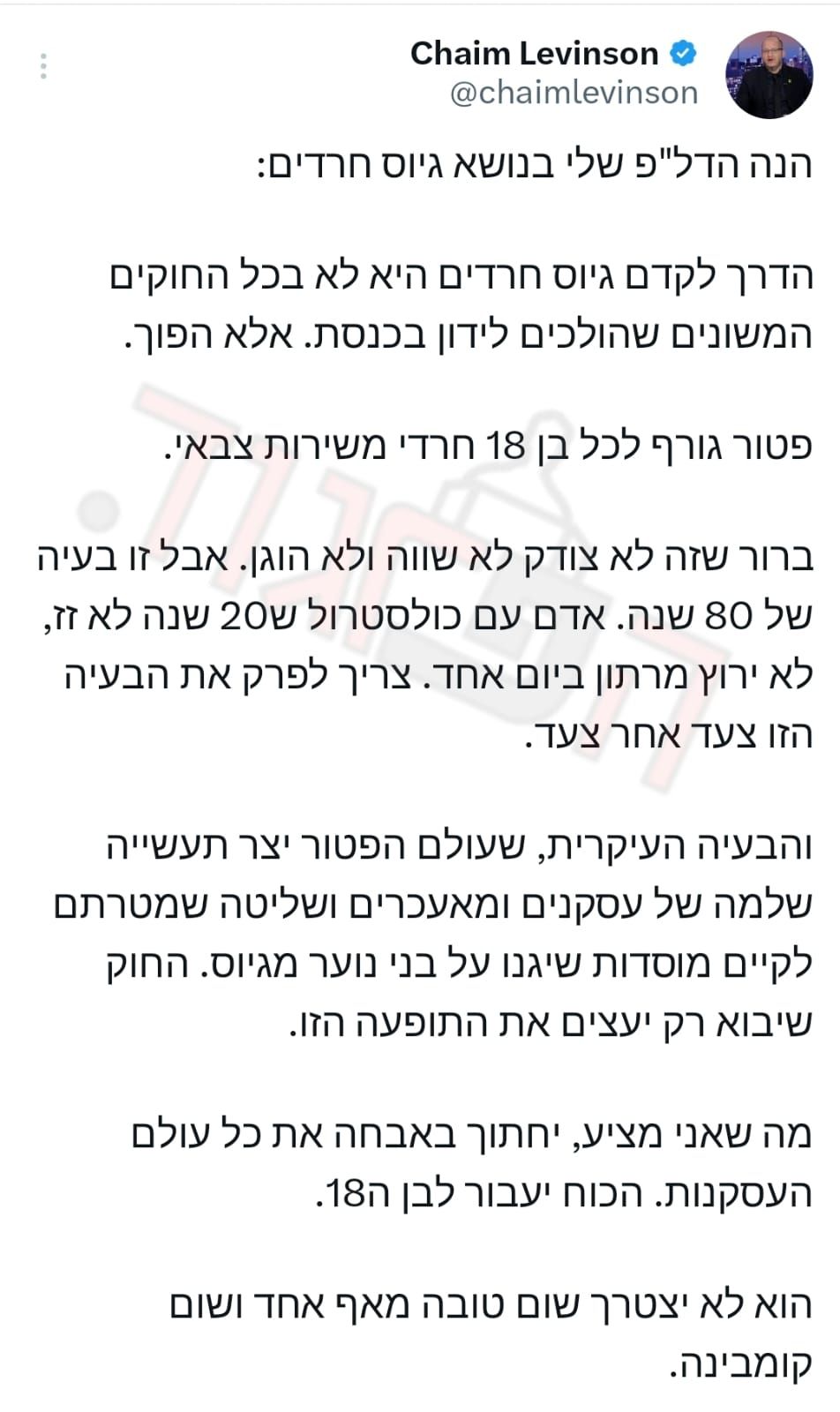 העיתונאי חיים לוינסון מציע פטור גורף לחרדים בגיל 18, בלי קומבינות ועסקנים. לדבריו, דווקא חופש הבחירה יוביל בהדרגה ליותר חרדים שיתגייסו מרצון. "זה יהיה הסיוט של המפלגות החרדיות כי הכוח יעבור לצעירים עצמם".