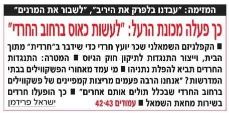 ספק אם בשטח החרדי יש לקונספירציה החדשה אחיזה רצינית, אבל היחצ"נים החרדים שמתראיינים בזה אחר זה ב"תחקיר" של ערוץ 14 מכינים כבר את הקרקע לקראת הבחירות, בהן הנרטיב של שיתוף הפעולה בין קפלן לפלג הירושלמי יעמוד בראש. כל ביקורת פנימית או חיצונית תוצג כחלק מ'מבצע ההשפעה' המגוחך הזה. שיהיה בהצלחה. (דניאל גרובייס)