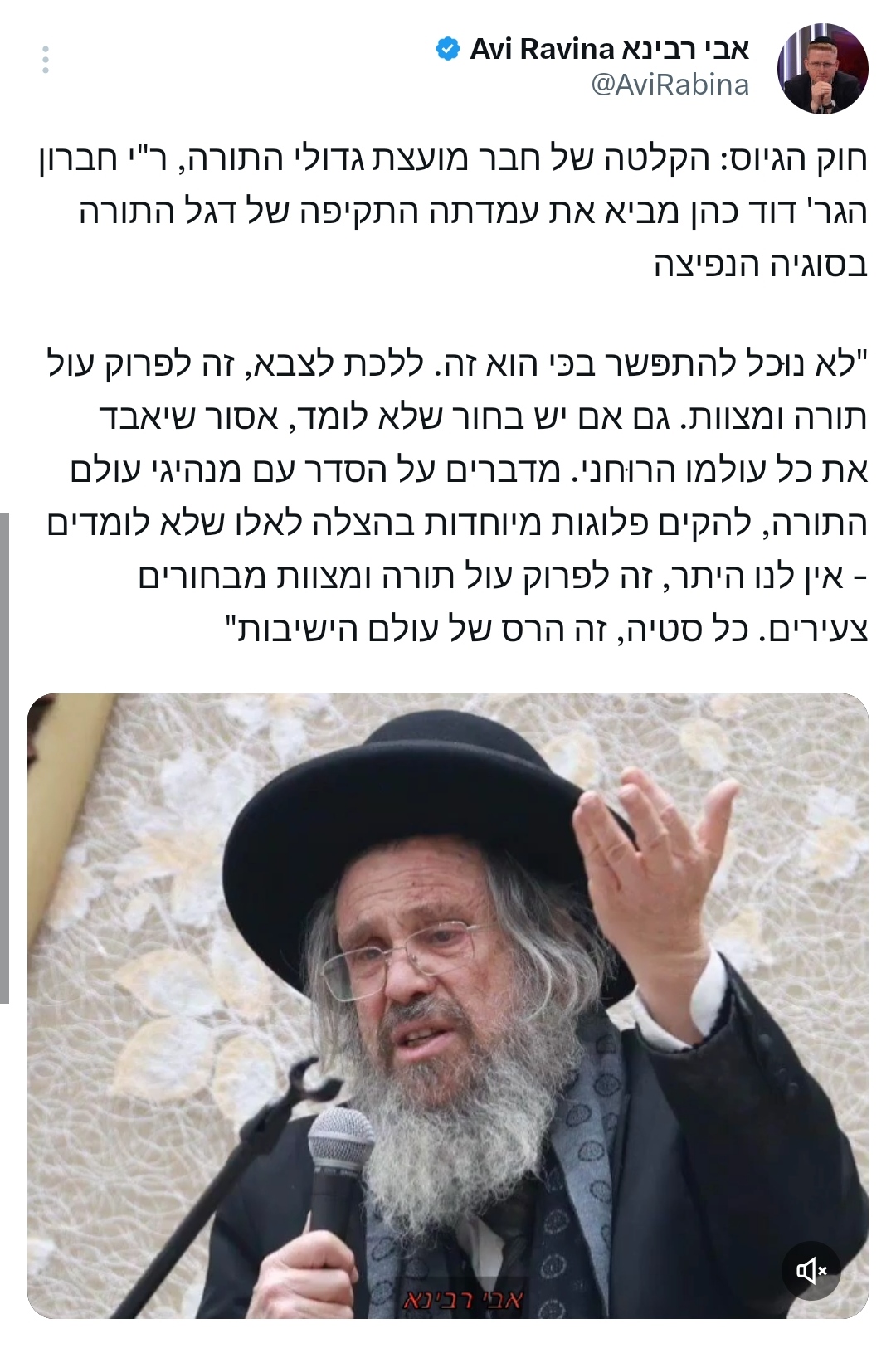 לדבריו, "הנזק שנעשה הוא כבר בלתי הפיך, אך עדיין אפשר להציל זאת, מי שמונע כל התעסקות בנושא כביכול הוא מייצג את בתי גדולי הדור, הוא זה שעושה את החור בספינה הכי גדול שהיהדות החרדית ידעה מאז קום המדינה. אסור להסכים לחוק המדובר בשום צורה ובשום מצב, הנציגים החרדים לא צריכים להיעדר מהדיון, אלא לפרוש עכשיו מהממשלה".