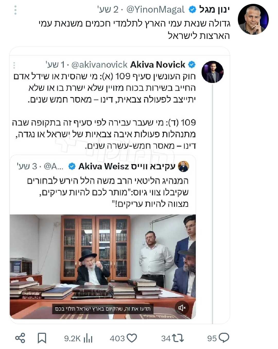 אברהם פריינד: איומי החרדים נגד קידום הרפורמה המשפטית נותנים ליועמ"שית את הכלי נשק הכי יעיל בארסנל. מעכשיו היא תעשה הכל לתקוע את חוק הגיוס בכל הכוח כדי שהחרדים ימשיכו לתקוע את הרפורמה.