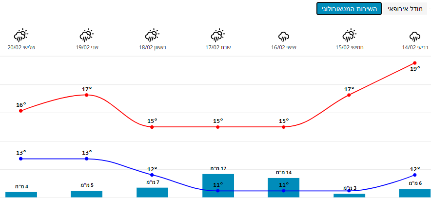 המודל האירופאי והשמ"ט מפתיעים הערב עם תחזית לרצף של שבעה ימי גשם בגוש דן