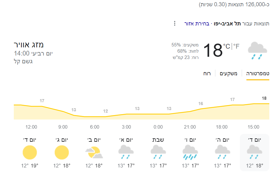 היום: מעונן חלקית עד מעונן. בעיקר במרכז הארץ ובצפון הנגב צפוי גשם מקומי ברובו קל. תחול עלייה בטמפרטורות והן תהינה רגילות לעונה. הלילה: מעונן חלקית.