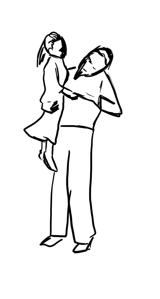 בציור המהיר ששירטטתי בתמונה עם האיש שמרים את הילד, ביקשתי מבעלי להרים את ביתי ושירטטתי אותם וכך נעזרתי בתנוחה.