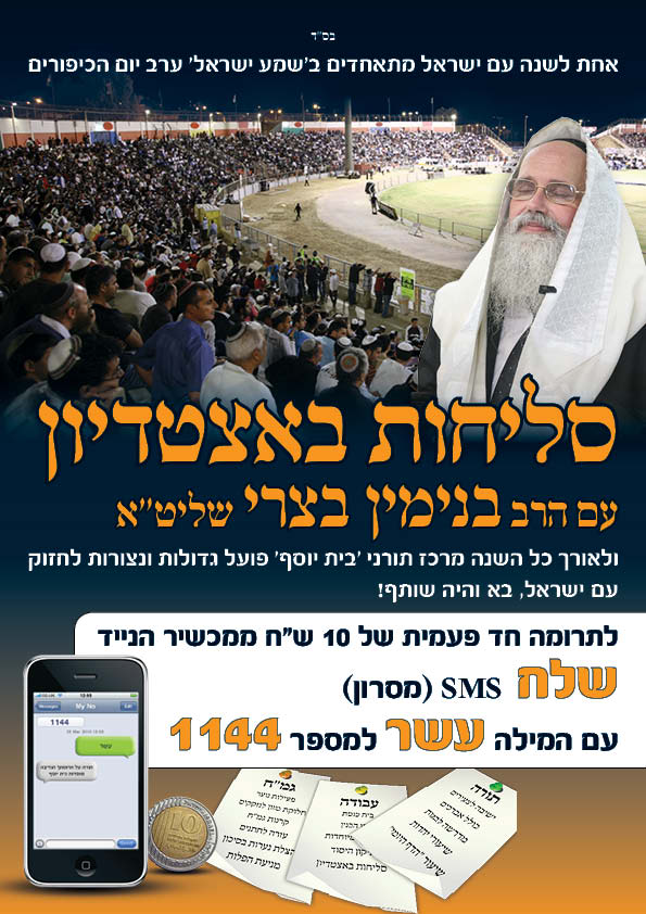 באוזני האלפים עדיין מהדהדת קריאת שמע ישראל הנאמרת מידי שנה במעמד הסליחות בערב יום הכיפורים הנערך בראשות הרב בנימין בצרי שליט"א באטדיון באר שבע.