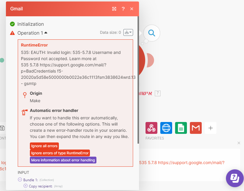 אני מנסה לעשות פעולה במודול ג'ימייל והוא כותב לי שהחיבור לא תקין.(תמונה 1)