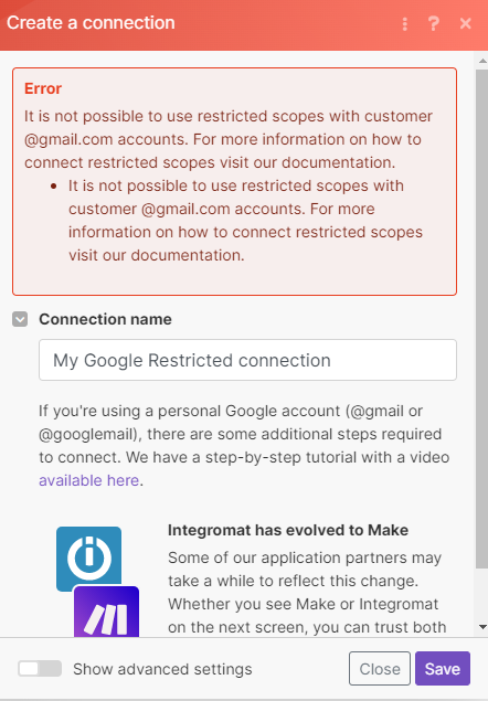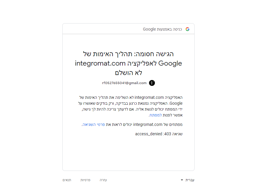 ניסת לעשות חיבור רגיל, וזה לא אפשרי משום מה בחשבון ג'ימייל פרטי אלא בחשבון עסקי, כדי לחבר את החשבון הפרטי שלך צפה בהדרכה של מייק על זה בקישור שהם שמו לך שם