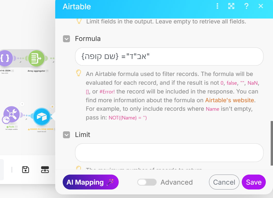 airtable חיפוש ערך המכיל גרשיים במודול Search Records במייק