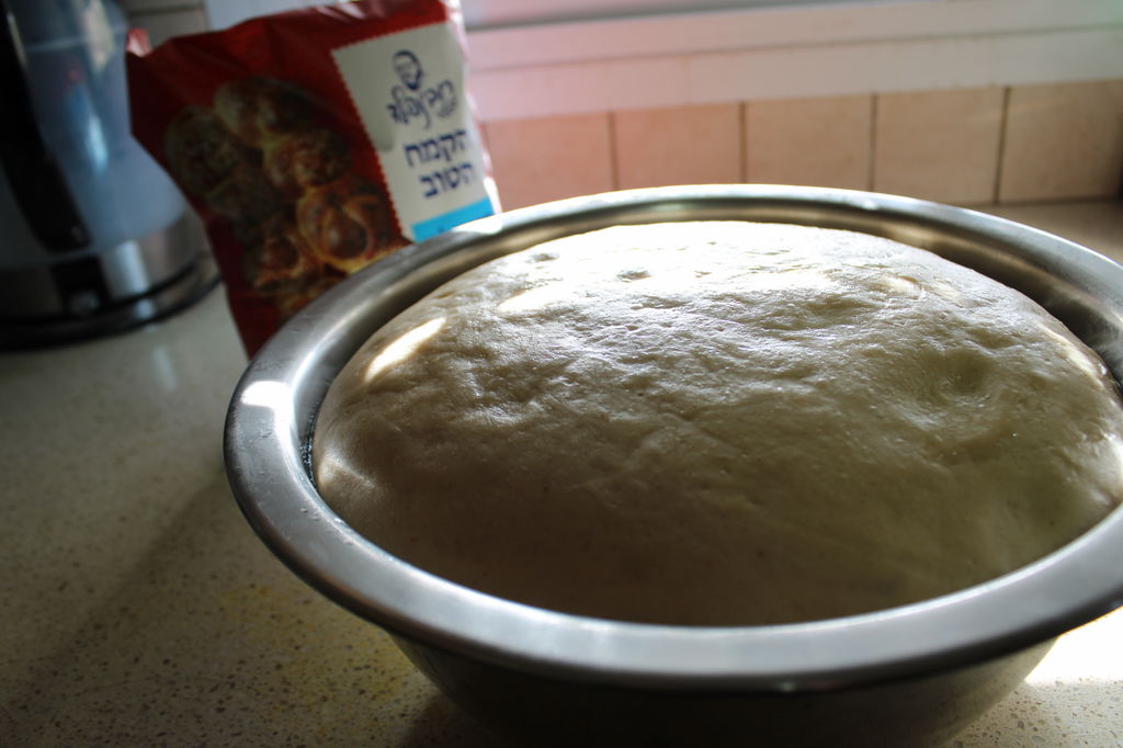 מכדררים את הבצק לכדור גדול. מרססים בשמן, מכסים בניילון מתפיחים להכפלת הנפח פי 2.5. הבצק תופח בצורה מטורפת.