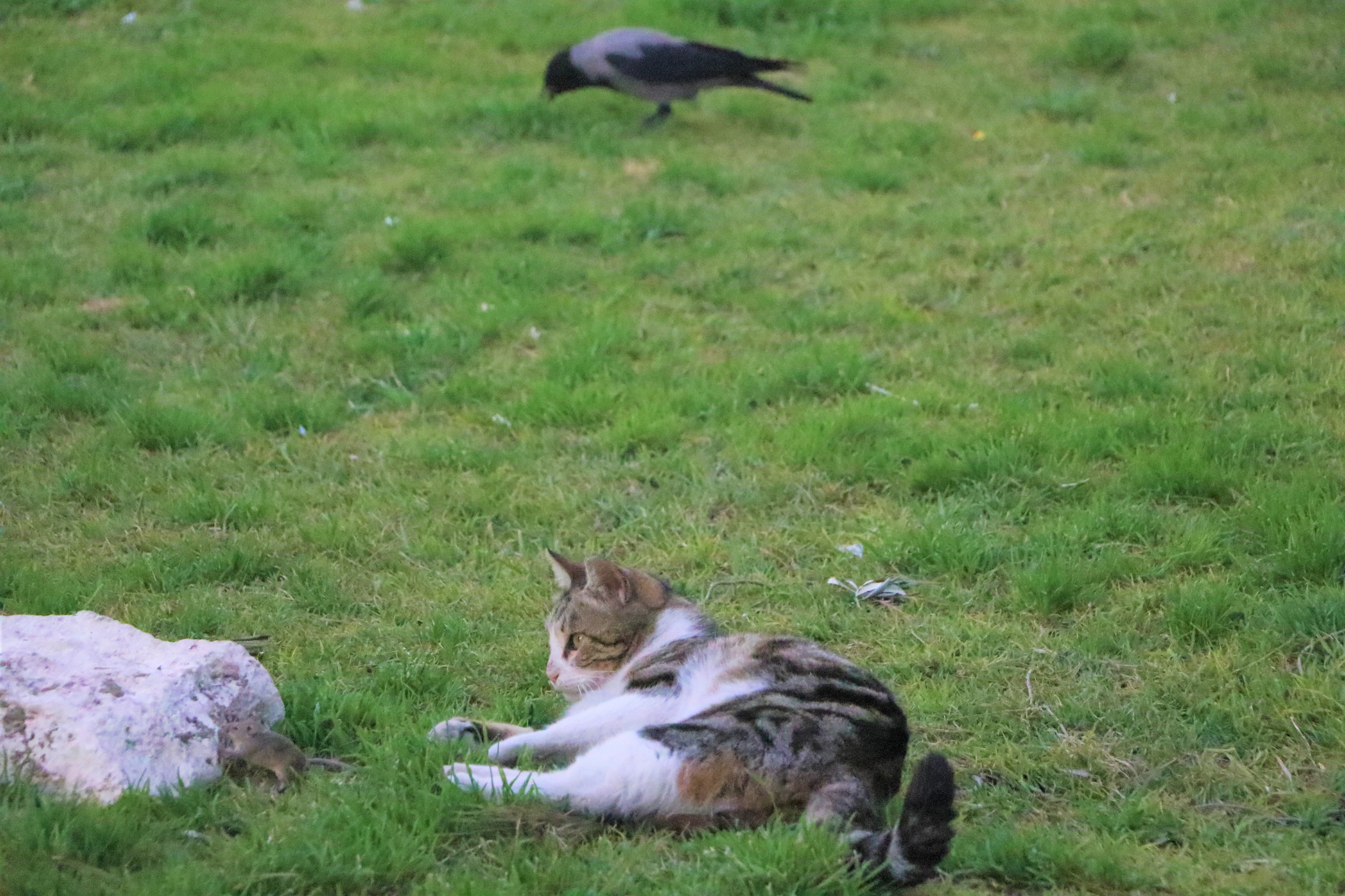 היו שם כמה עורבים שחיכו שהחתול יסיים את מלאכתו כדי לטעום גם מהסעודה, וכל הזמן הם עפו קרקרו והסתובבו סביבנו...