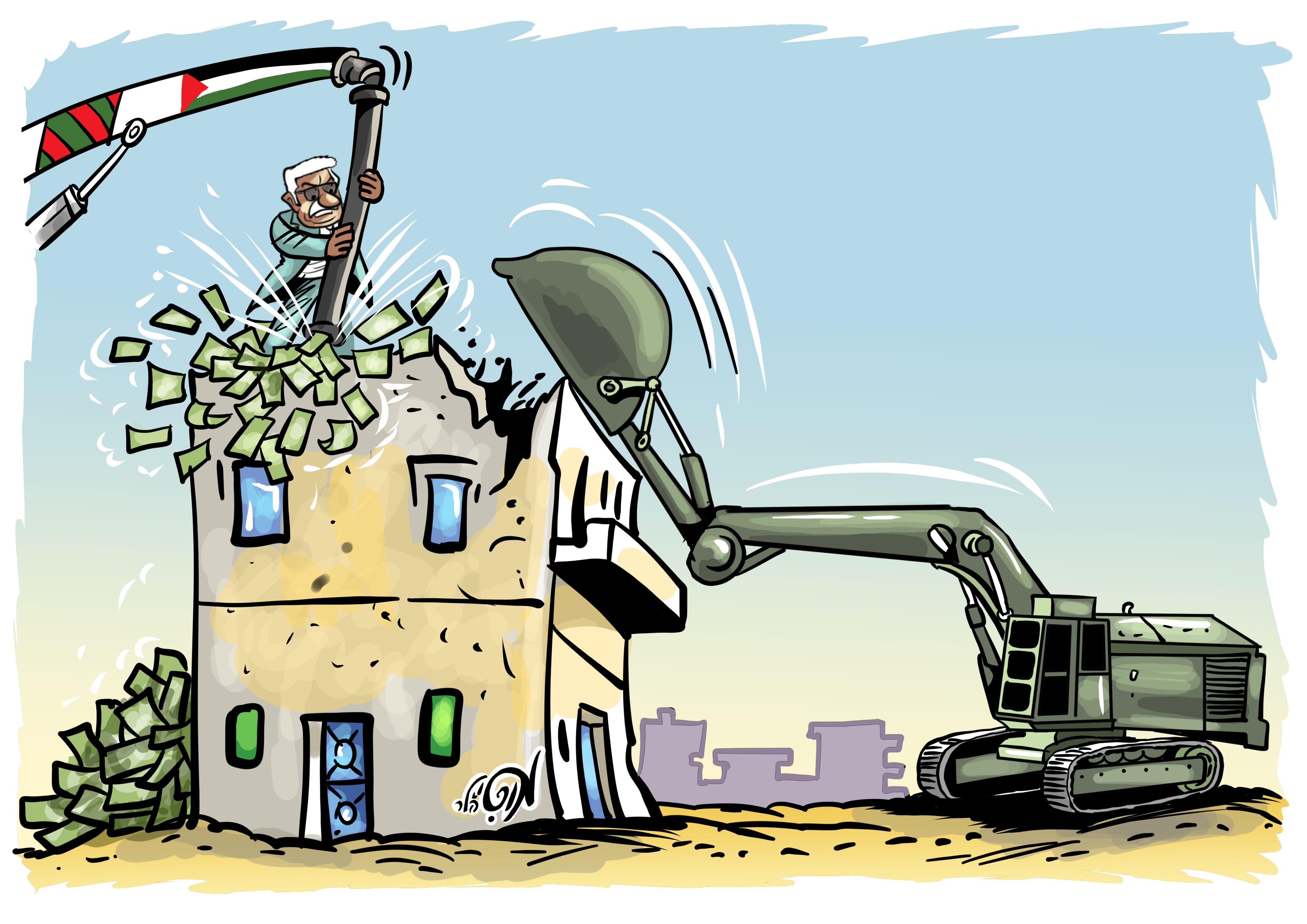הצייר מוטי הלר בהסבר ציורי למושג "פינוי בינוי"... ככה הוא כנראה משתמע בגרסה הפלסטינית... (פורסם בעיתון המודיע).
