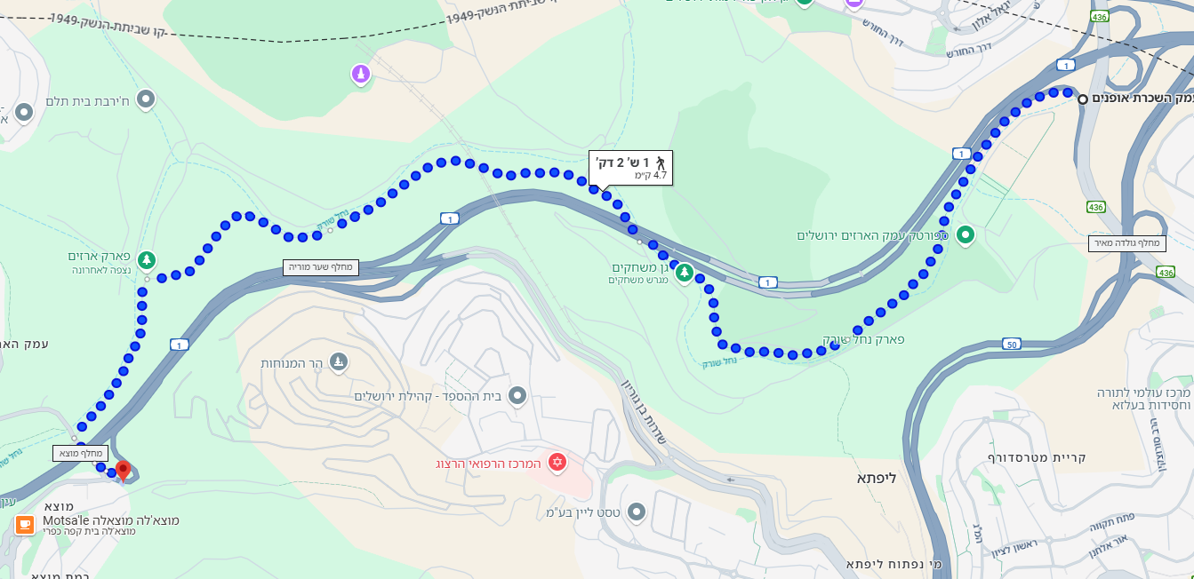 אבל יש את המסלול אופניים שמירושלים (גבעה צרפתית, צומת רמות) למוצא, השביל סלול ברובו (עד פארק האבנים, בערך 10 דק' הליכה ממוצא) ויש תחבורה ציבורית מצויינת משני הכיוונים.