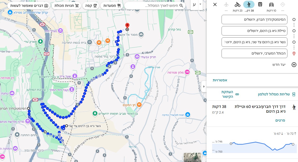 גיא בן הינום: ירידה די תלולה לגשר, ועלייה קשה בחזוראני מעוניין לטייל בירושלים בשעות הבוקר המוקדמות (להתחיל 7:30-8:00) עם עגלות וילדים קטנים ומתלבט בין עמק הארזים לגיא בן הינם+כותל