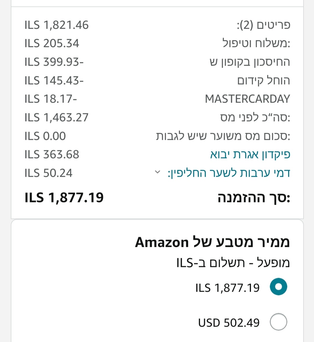 היה 110$ קופון, בנוסף היה קופון מאתר בארץ 40$ יתכן והיה לי עוד של מסטרקארדי, ואז הוספתי מוצר זול.