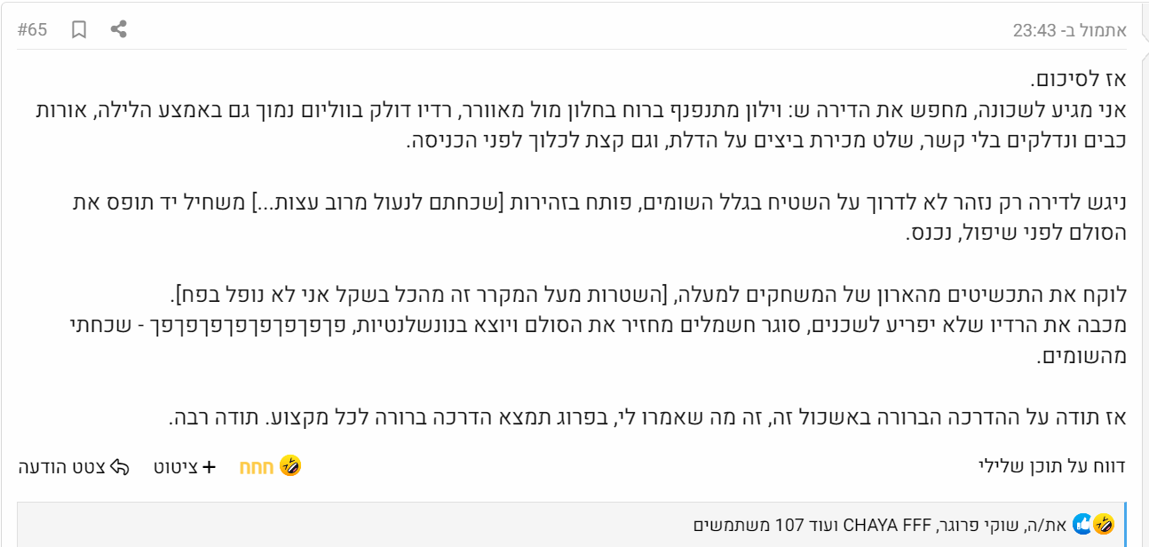 ניגש לדירה רק נזהר לא לדרוך על השטיח בגלל השומים, פותח בזהירות [שכחתם לנעול מרוב עצות...] משחיל יד תופס את הסולם לפני שיפול, נכנס.