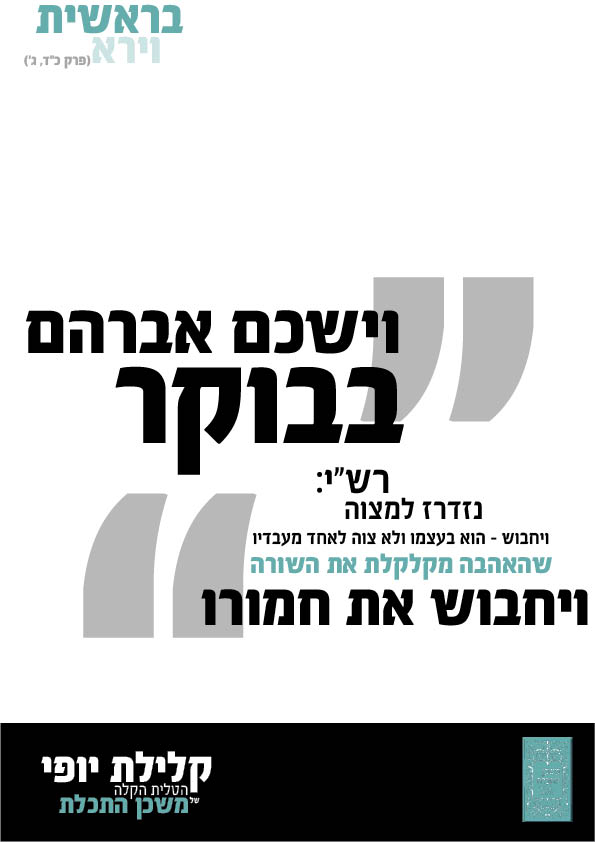 ובקשר להסבר: אני חושבת שהמסרים ברורים רק התפלאתי לקרוא שלא מובנת הציטוט של אברהם אבינו מכיתה א' א5ני יודעת את זה שאברהם חיבב את המצווה ולכן הוא בעצמו חבש את חמורו לכן אמרתי לחוצניק שפשוט יפתח את המקור...