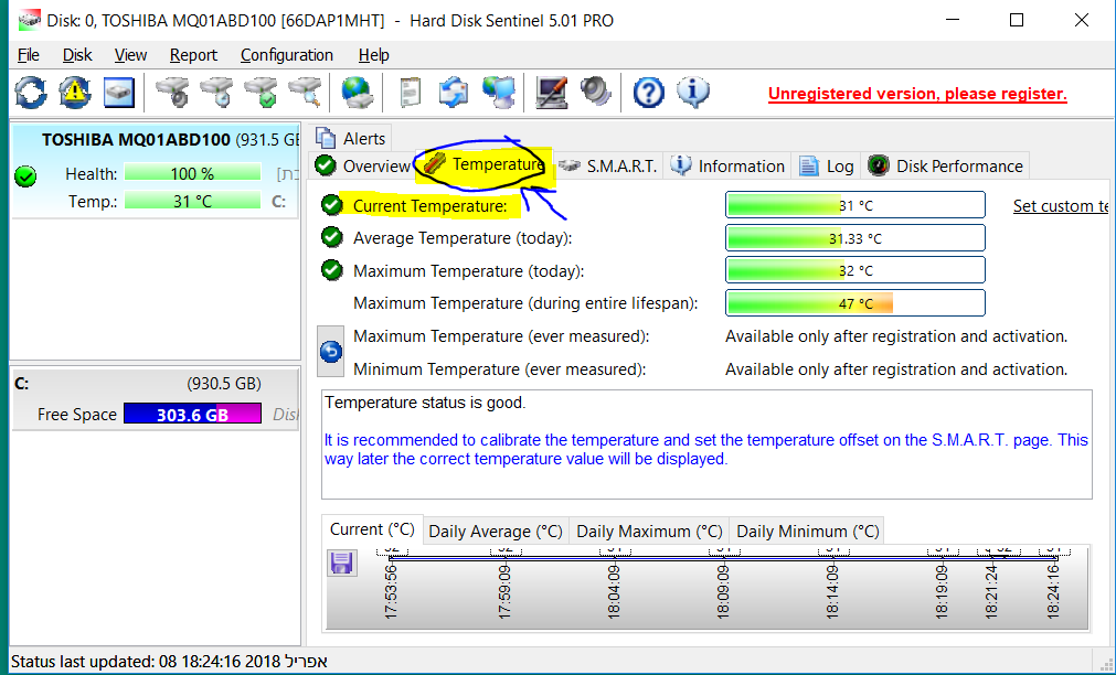 אמש כפי הנראה הייתה עבודה מאומצת של הדיסקים משום מה, (המחשב היה תוך כדי עדכון משמעותי, ואולי זו הסיבה). הבוקר המחשב דלוק כבר שעתיים, בעבודה רגילה. כעת הדיסקים אוחזים 40-42 מעלות. כאשר כל הזמן הטמפרטורה עולה בצורה מתונה.
