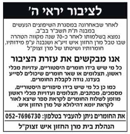 דרוש מידע ידעתם שלחזון איש זצ''ל היה מקווה בבית?