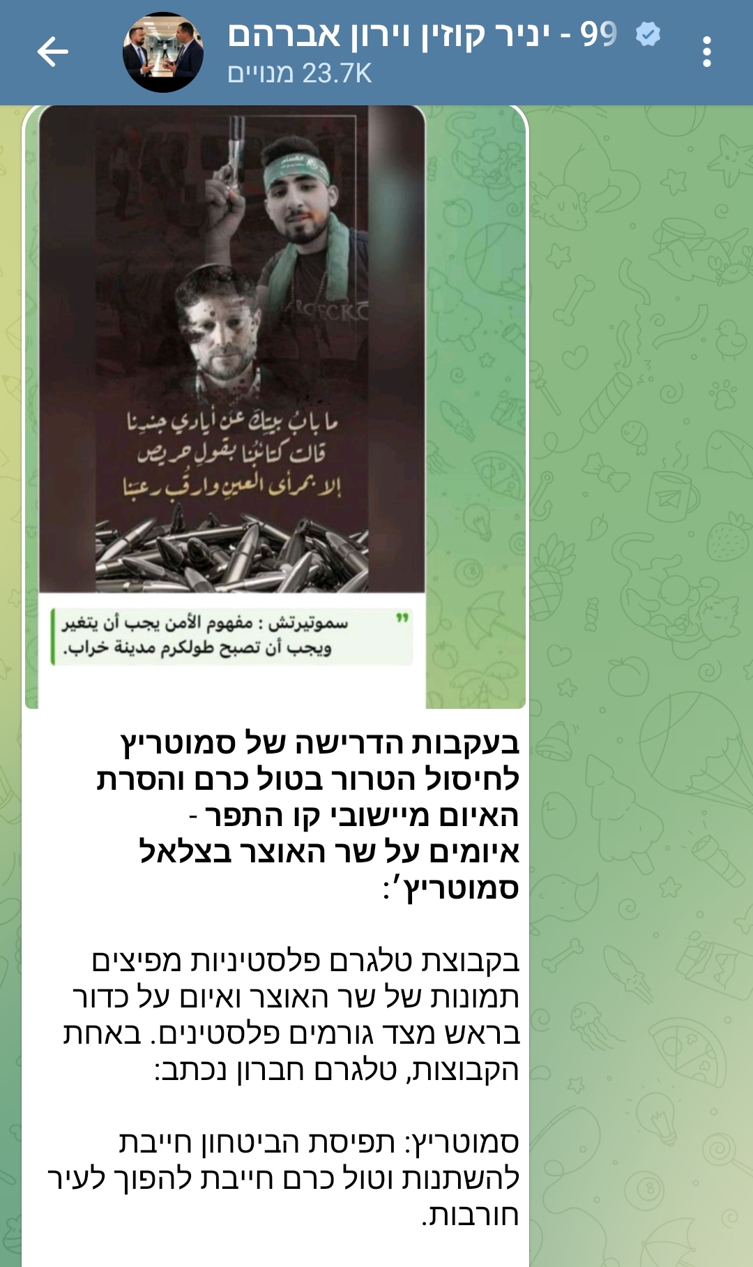 בעקבות הדרישה של סמוטריץ לחיסול הטרור בטול כרם והסרת האיום מיישובי קו התפר - איומים על שר האוצר בצלאל סמוטריץ׳: בקבוצת טלגרם פלסטיניות מפיצים תמונות של שר האוצר ואיום על כדור בראש מצד גורמים פלסטינים. IMG_20240707_154712.jpg