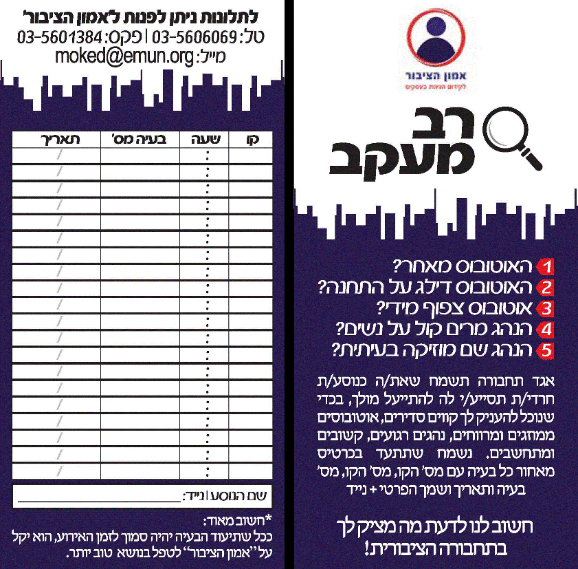 הכנתי "רב מעקב" שכל נוסע (לא רק גרפיקאים, גם נוסעים מכל הציבור) יוכל לדווח לע"ר "אמון הציבור" ב5 שניות על השעון.