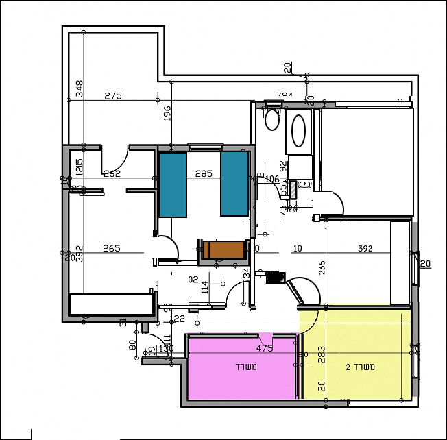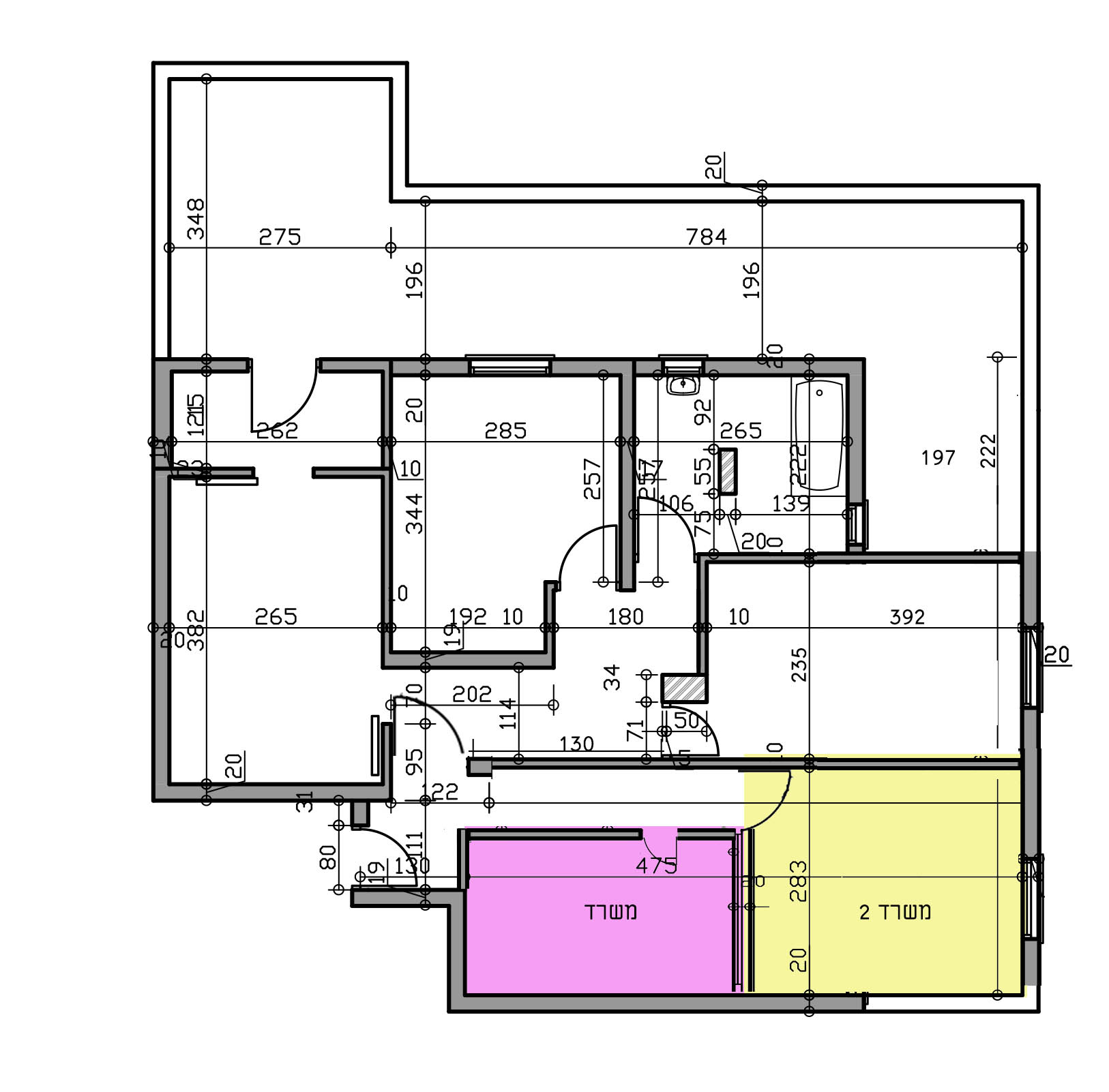 אם יש אפשרות להזיז גם את המשרדים ולשחק עם כל החלל כולו. הייתי מציעה לנסות אופציות נוספות עם חלוקה אחרת כדי שכל יחידה \ משרד יוכל לתפקד נכון עם גדלים נכונים ומתאימים, הן בגודל החלל\חדר והן במעברים\פתחים.