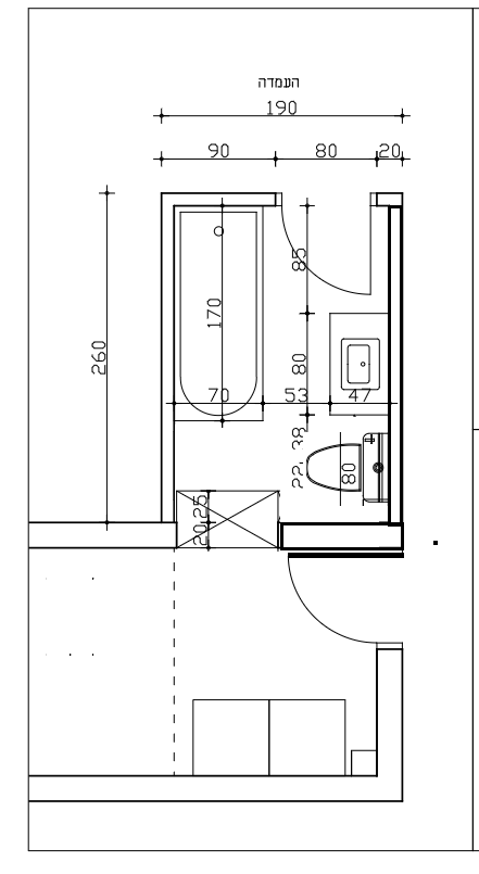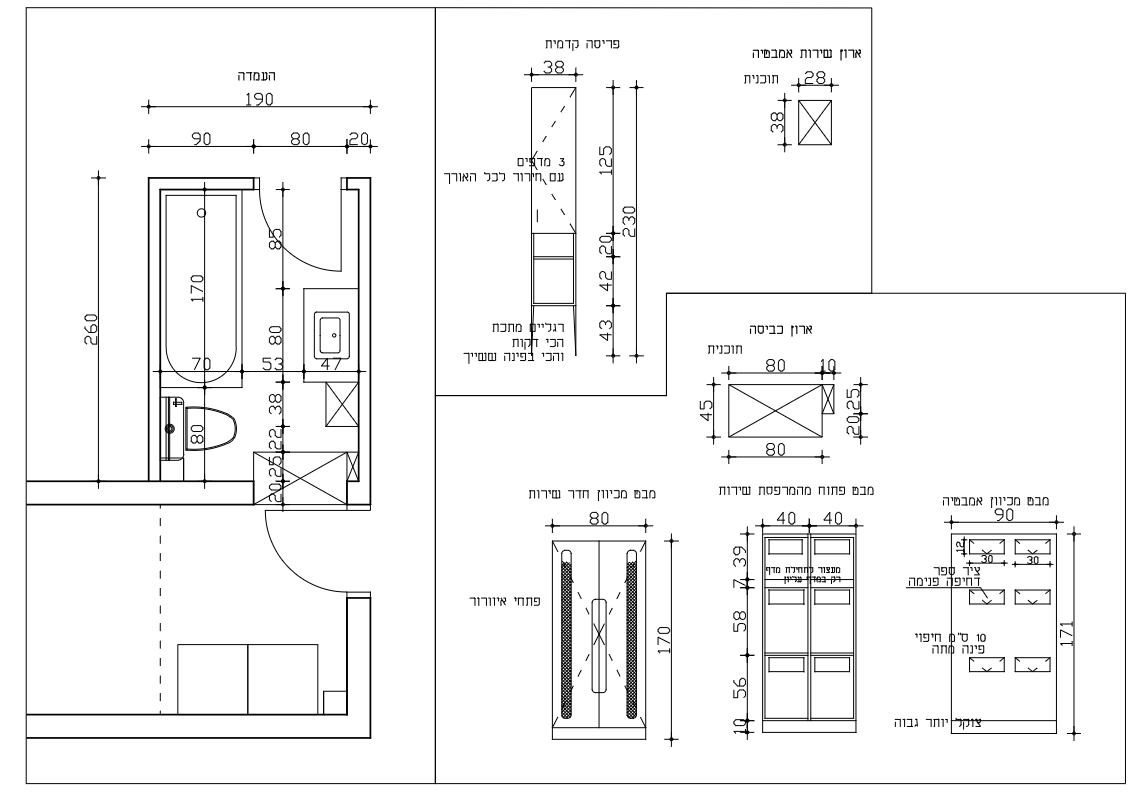 (בשירטוט יש גם ארון קטן נוסף באמבטיה עצמה. כמו כן לארון יהיה ידיות כפתור רגילות ולא אינטגרלי)