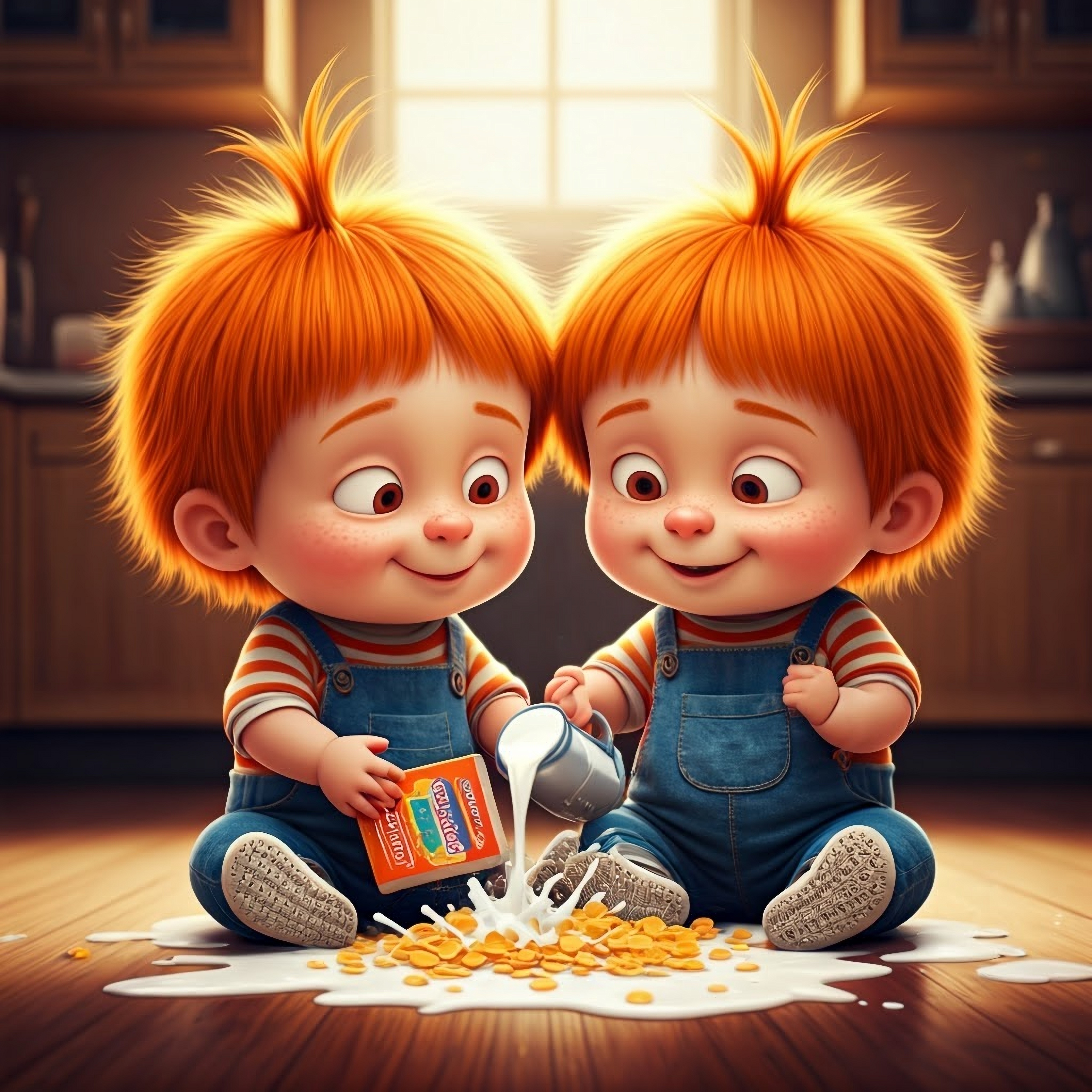 Two twins, with a mischievous smile, two years old, with orange hair, are sitting on the floor in the center of the kitchen, one twin is holding a box of Conreflex cornflakes, and is scattering the contents of the box on the floor, and the other twin is pouring milk on the flakes on the floor, the milk is splashing everywhere,