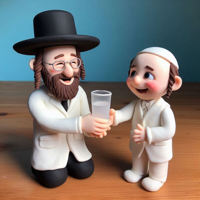 A work of art made entirely of plasticine of a small boy (Jewish) serving a glass of water to his father (also Jewish)
