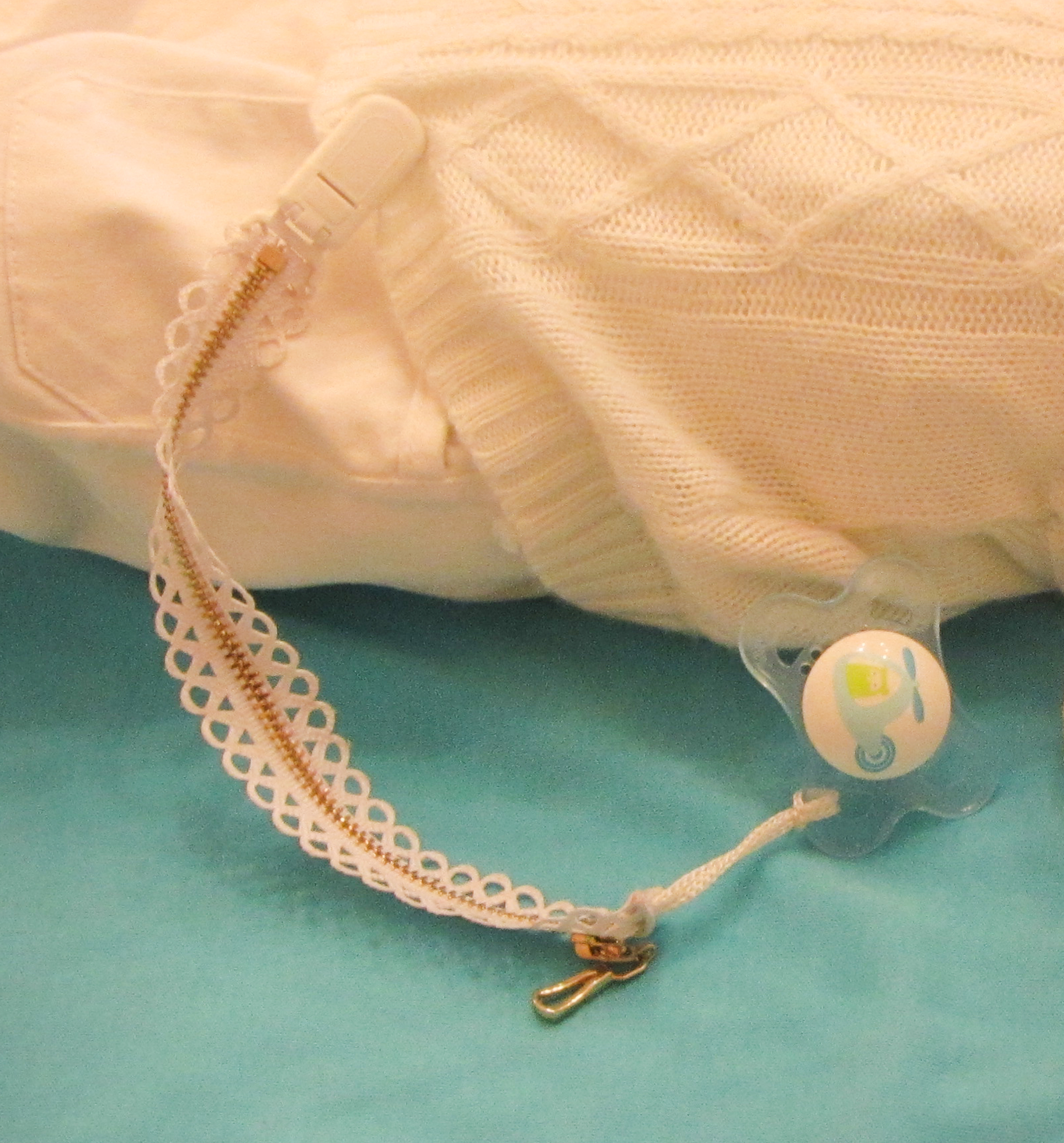 בוחרים רוכסן בצבע המתאים, מחברים בצד אחד קליפס של שלייקס, בצד השני- לולאה משרוך ו...הנה לכם מוצץ לתפארה!