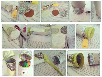 אופן ההכנה: גוזרים את גליל הנייר במיקום המסומן בהתאם לצילום וזורקים את החלק הקטן. מגלגלים את החלק הגדול על פני הבד ומורחים דבק בקצה הבד לסגירה. שולפים את גליל הבד החוצה. הופכים בעדינות את הבד ומשחילים אותו לתוך הגליל. מורחים דבק בקצות הגליל, מקפלים את השוליים על גבי הגליל ומהדקים היטב. מעמידים את הגליל על השעוונית ומסמנים היקף בעפרון. מציירים עיגול נוסף גדול יותר ב-1 סנטימטר מהעיגול המקורי. גוזרים מחתיכת קרטון את גודל העיגול הקטן ומהשעוונית והבד את גודל העיגול הגדול. מדביקים בסנדוויץ' את השכבות. מורחים שכבת דבק בקצה הגליל ומדביקים את הסנדוויץ' לגליל לסגירת צד אחד (ניתן להחליף בתפירה). מדביקים את הרוכסן בקצה הפתוח כשהשיניים בולטות. גוזרים את בד השעוונית ומדביקים לגליל. גוזרים את שארית הבד בצמוד לקצה הגליל. חוזרים על אותם שלבים גם בגליל הקטן כשפותחים את הרוכסן לחיבור קל יותר בין השניים.