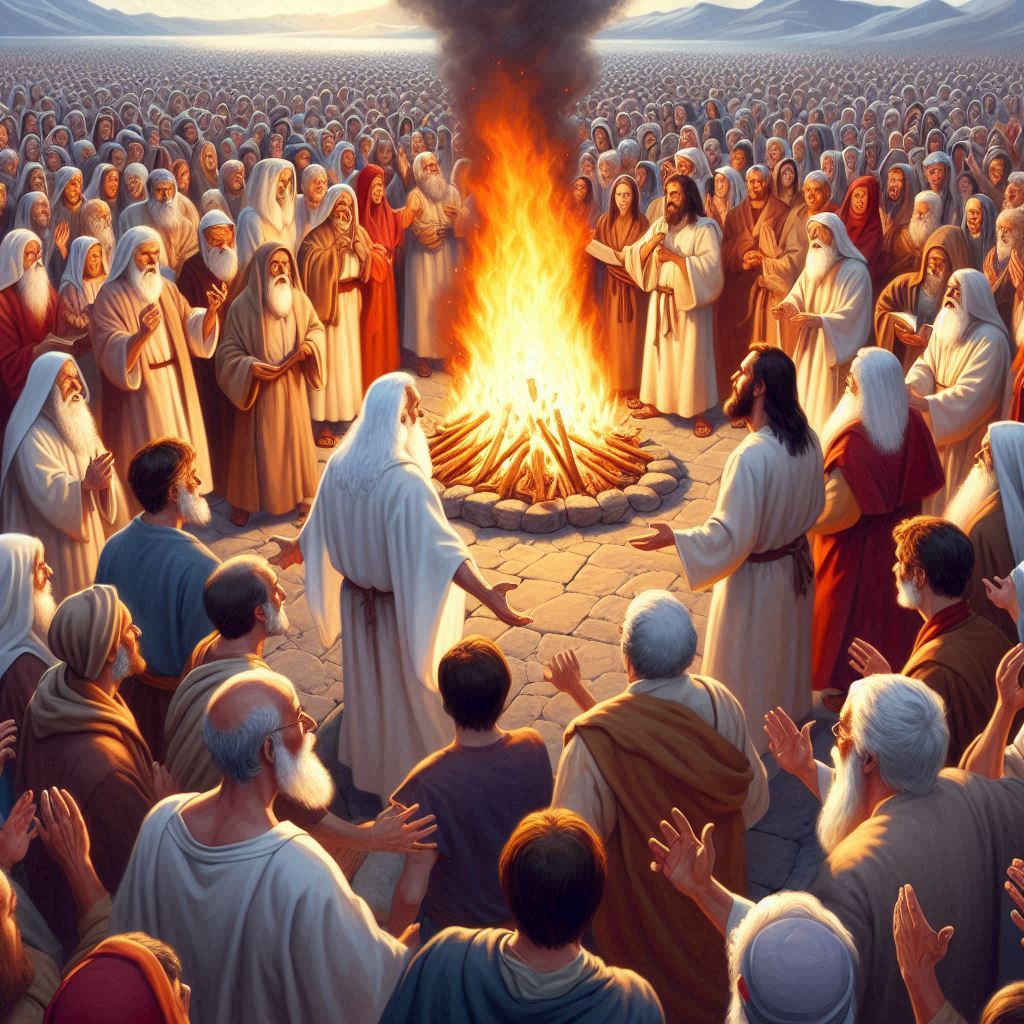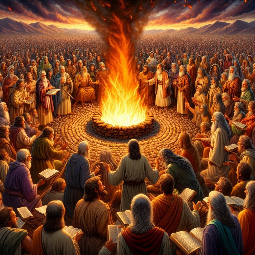 2. מדורת המולך. המוני אנשים נקבצים ובמרכז אש בוערת