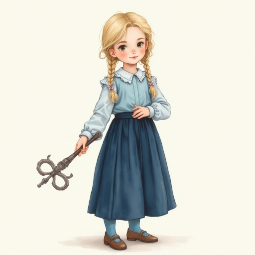 ילדה בת 5 לבושה בתחפושת של אמא מחזיקה תינוקת, עומדת, חצאית ארוכה, גרביים עד מעל הברך, נעליים ב...jpg