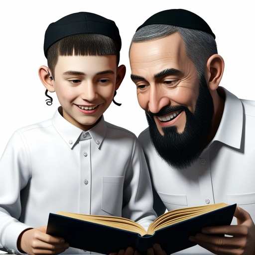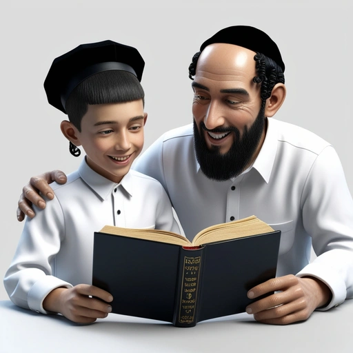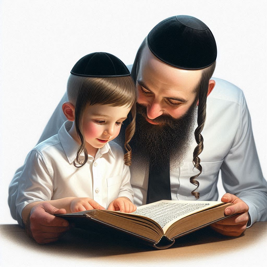 ילד יהודי חרדי לובש חולצה לבנה מכופתרת. כיפה שחורה . שיער קצוץ, ללא שיער על המצח. חתיכת שיער דק מסולסל צמוד לכל לחי. לידו יושב אבא שלו, בעל חזות יהודית אוקטודוקסית הכוללת חולצה לבנה, שניהם מסתכלים ביחד באותו הספר, הספר מאיר להם את הפנים, התמונה משדרת אושר. רקע לבן. ריאליסטי